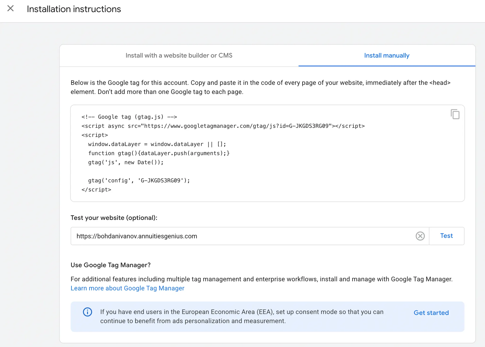 4. Complete the setup process to get your tracking code, select “Insert Manually”